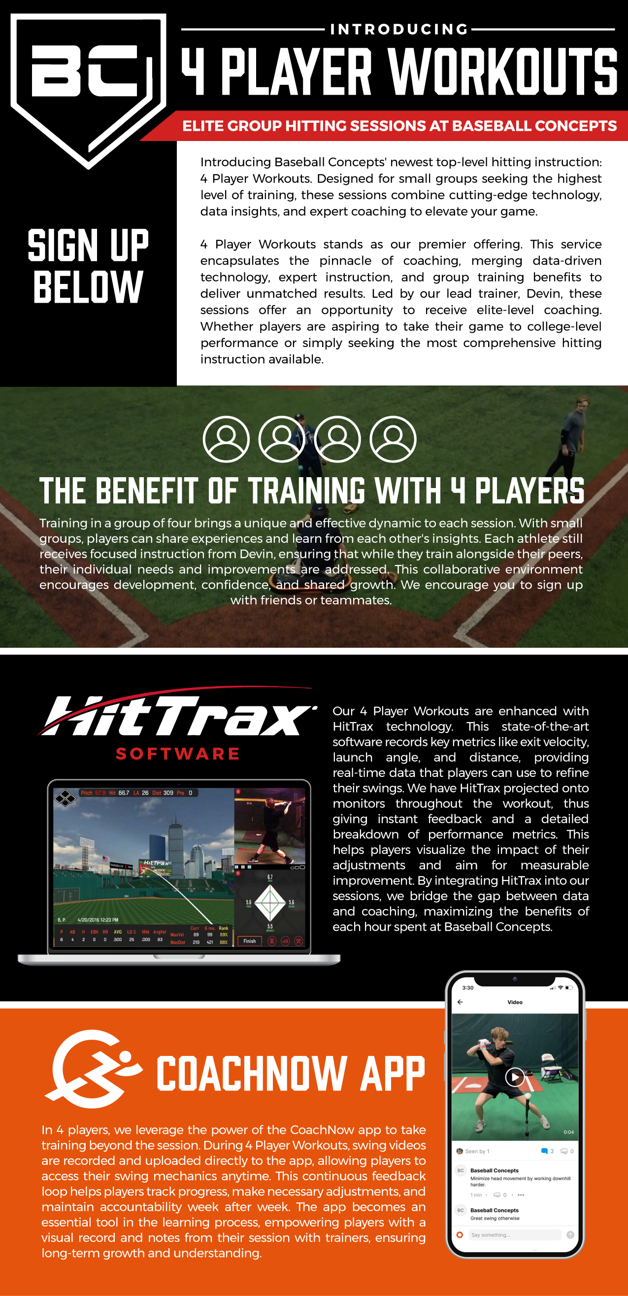 For four player workouts you can bring your small group of four to train together for an hour on a weekly basis. Only one member needs to reserve the session and pay. If families want options to pay individually (by check or venmo) email baseballconcepts@gmail.com for help.