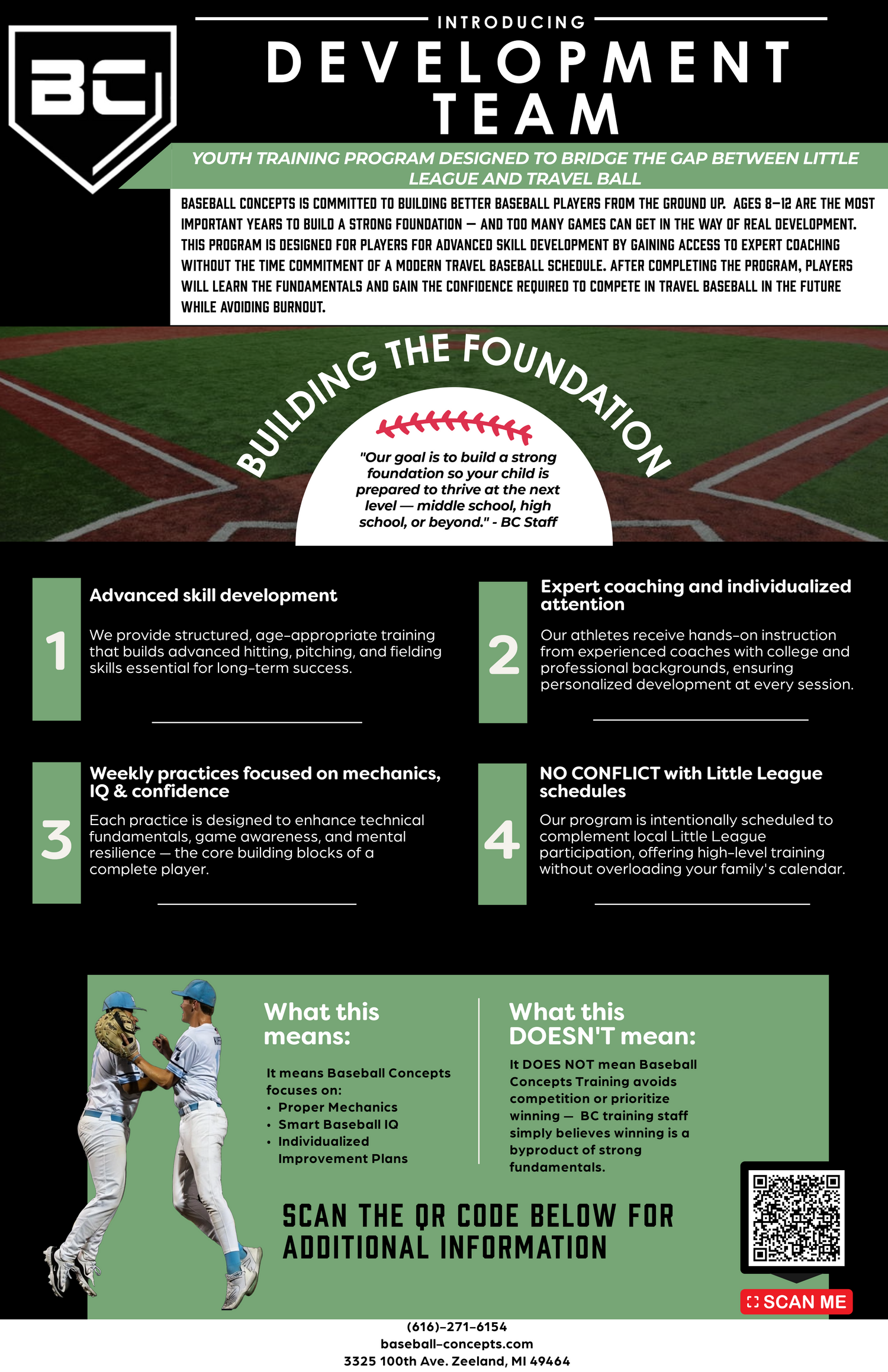 Interested in travel baseball but don't want to commit all your weekends? Receive professional instruction all winter long at SportsQuest without the commitment of travel baseball all summer with the BC Development Program 8-12u.